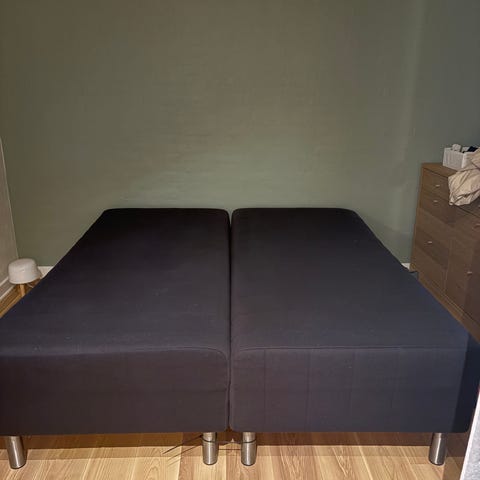 Ilva seng med lamelbund. Sengen består af en ramme med indbygget lamelbund og polstret yderside i gråt tekstil. Konstruktionen er i træ med stofbetrukne sider.