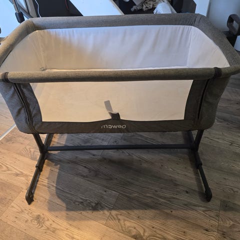 Moweo bedside crib i grå tekstil. Sengen har justerbar højde og kan stå ved siden af forældrenes seng. Den ene side kan åbnes, så barnet ligger tæt på sengen. Siderne har netvinduer, der giver ventilation og mulighed for at se barnet. Sengen står på metalstel med hjul for nem flytning. Velegnet som babyseng i de første måneder.