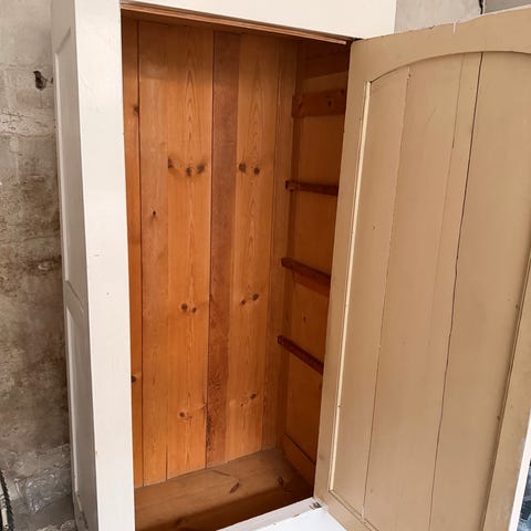 Gratis hjørneskab i lyst træ. Den nederste låge lukker kun tæt, når nøglen sidder i.