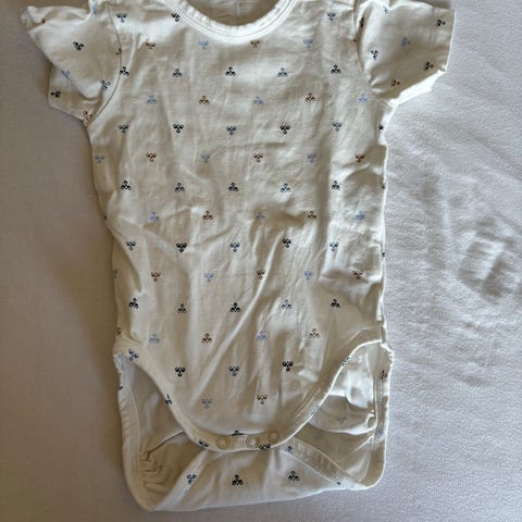 Hummel kortærmet body i størrelse 80. 95% økologisk bomuld, 5% elastane. Aldrig brugt, har ligget som ekstra i pusletasken. Kun vasket i neutral vaskemiddel.