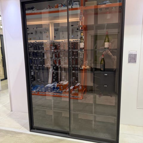 Skabet består af tre skydelåger, to sorte og et med spejl. Lækker indmad flere hylder, skuffer, bøjlestænger, udtræksbuksebøjlestang og værdiskab.