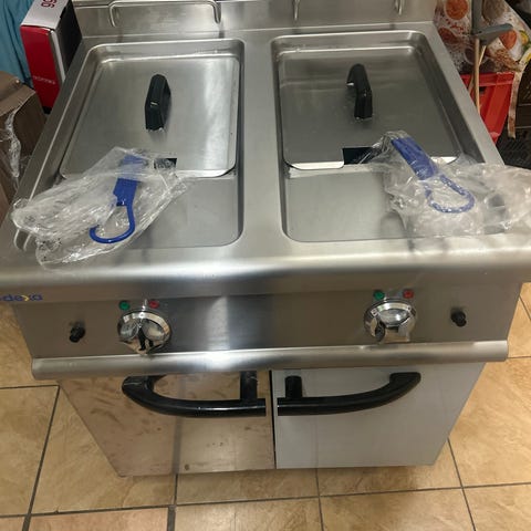 Industriel dobbelt frituregryde på underskab i rustfrit stål. Enheden har to separate friturekar med individuelle betjeningsknapper på fronten til regulering af temperatur. Lågene til karene er aftagelige og udstyret med håndtag i plast. Underskabet har dobbeltdøre med håndtag og plads til opbevaring af tilbehør eller tilslutningsudstyr. Kabinettet står på ben, som giver stabilitet og gør rengøring under enheden lettere. Velegnet til professionelt køkkenbrug, hvor der er behov for to friturezoner i samme enhed.