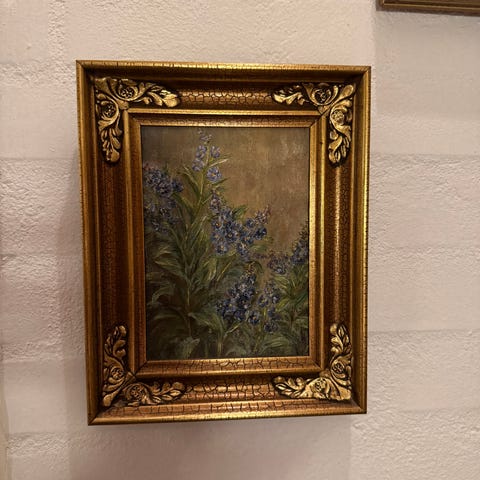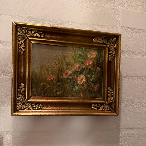 Bredde 48 cm Højde 57,5 cm. med guldlignende ramme, billedet hænger i Aabenraa men kan efter aftale afhentes i Gentofte