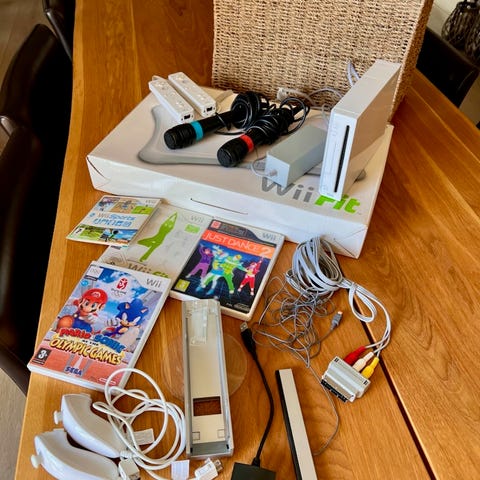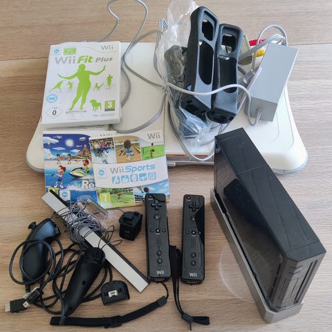 Inkl. kabler, sensorbar, to Wii Remotes, Én Wii Nunchuk, Balance Board samt fire spil.