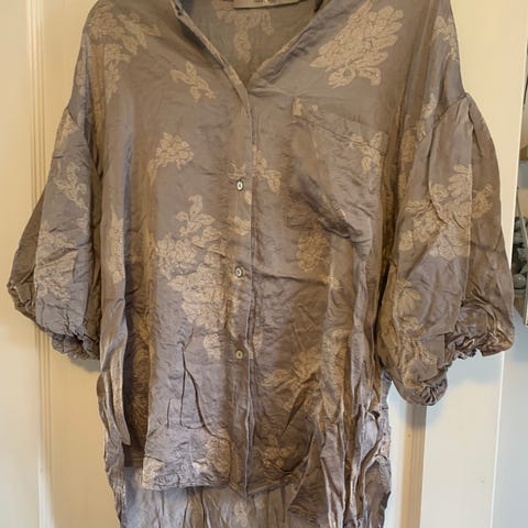 T-shirt, Costamani , str. 38, Grå / Blå, Polyester, Næsten som ny, Smuk sommer t-shirt med bindebånd foran, som du kan vælge at klippe af. Den er lavet i en fin gråblå farve med traner på. Passer perfekt til bukserne. Nypris 399,- Kommer fra ikke-ryger hjem og kan sendes til en GLS pakkeshop for kr. 40,- på købers regning