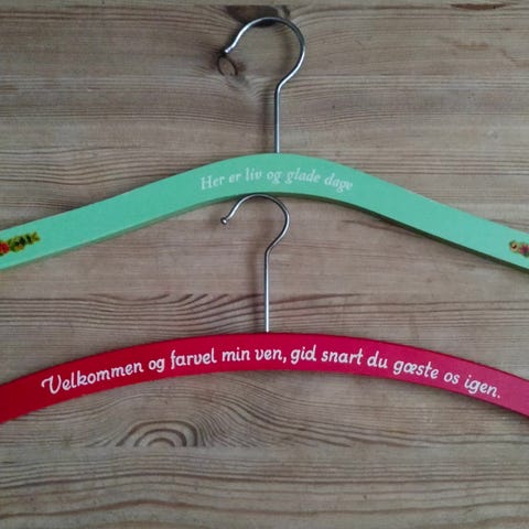 Gul bøjle med lilla deko og navnet Sara. Blå bøjle med hvid deko og navnet Svend.