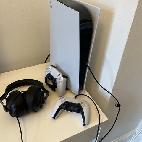 Sony PlayStation 5 spillekonsol i hvid. Konsollen understøtter gaming i høj opløsning og hurtige indlæsningstider. Medfølgende DualSense-controller (hvis inkluderet af sælger) giver haptisk feedback og adaptiv trigger-funktion. Egnet til brug med kompatible PlayStation 5-spil og til streaming af medier via understøttede apps. Tilsluttes typisk via HDMI til tv eller skærm og kræver strømtilslutning samt eventuel internetforbindelse for onlinefunktioner.