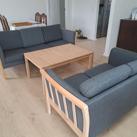 3'er sofa med skammel og lille hvidt bord medfølger