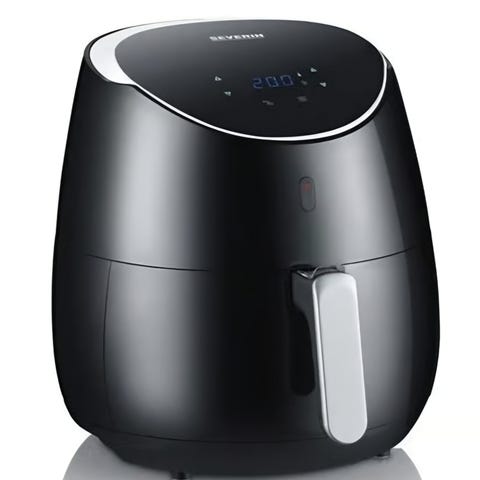 Severin airfryer i sort med sølvfarvet top og digitalt betjeningspanel. Enheden har aftagelig kurv og skuffe, som gør det muligt at tilberede mad med varm luft. Airfryeren er egnet til tilberedning af f.eks. pommes frites, grøntsager og mindre kød- eller fiskestykker. Betjeningspanelet har knapper til temperatur- og tidsindstilling. Velegnet til brug i køkkenet til daglig madlavning uden brug af meget olie.