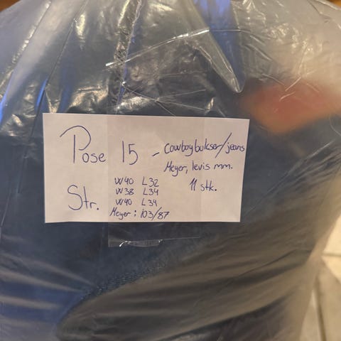 Stor pose mærkevarer til mænd med 5 par bukser og 4 striktrøjer.
