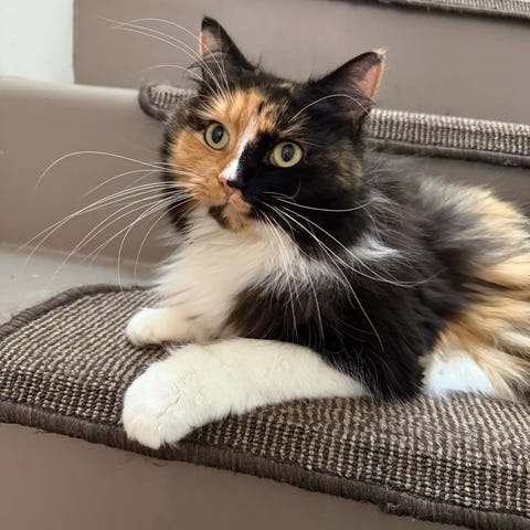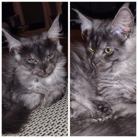 Langhåret maine coon i cremefarvet pels. Katten har lys, lang og fyldig pels med busket hale. Egnet som familiekat.