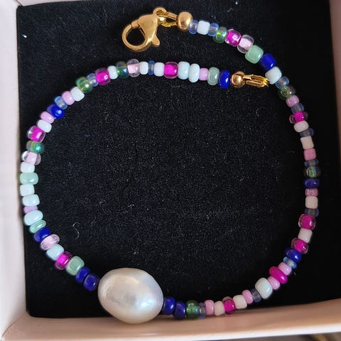 Armbånd, bijouteri, Hjemmelavet., Enkle fine armbånd. Armbåndene er lavet med japanske glasperler, som er trukket på en silketråd. De fleste metaldele er sterling sølv/forgyldt sterling sølv, dog er visse dele forsølvet eller forgyldt messing.Jeg ved ikke hvor længe armbåndet holder men for at forlænge levetiden, så anbefaler jeg ikke at bade eller sove med armbåndet.
