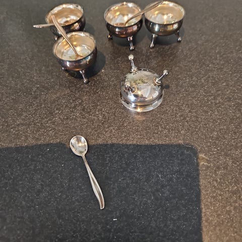 Salt- og pebersæt i sølvfarvet metal med ornamenter