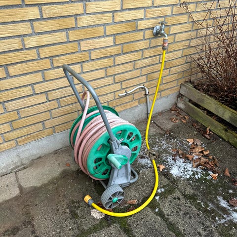Haveslange med slangevogn. Slangen er monteret på en mobil slangevogn i metal med håndtag og hjul, så den er nem at flytte rundt i haven. Egnet til almindelig havevanding og tilslutning til udendørs vandhane. På billederne ses standardkoblinger til vandtilslutning. Kommer fra dødsbo så tilstanden er usikker.... Men har været i brug i efteråret uden problemer...