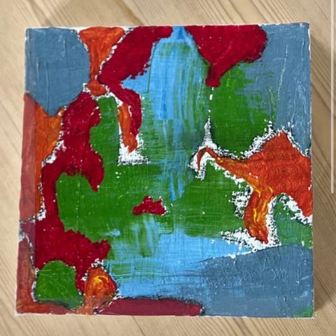 Abstrakt maleri på lærred i flere farver, herunder rød, grøn, blå, orange og lysegrå. Maleriet er udført med kraftige penselstrøg og en struktureret overflade. Det er malet på et opspændt lærred med hvide kanter og kan hænges direkte på væggen. Velegnet som vægdekoration i stue, soveværelse eller kontor.