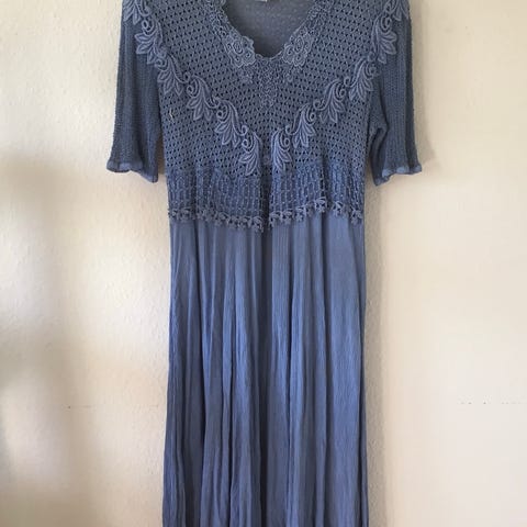 Elegant lang kjole uden ærmer, men med flot bæger stykke der har læg der afsluttes med en halskanten.