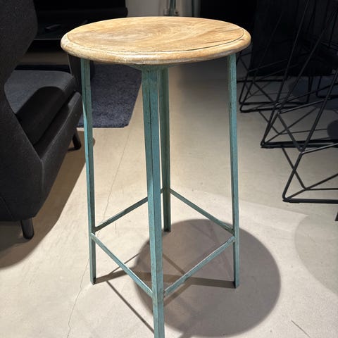 Barstole af bøg, runde sæder betrukket med uld, stel af grålakeret stål.