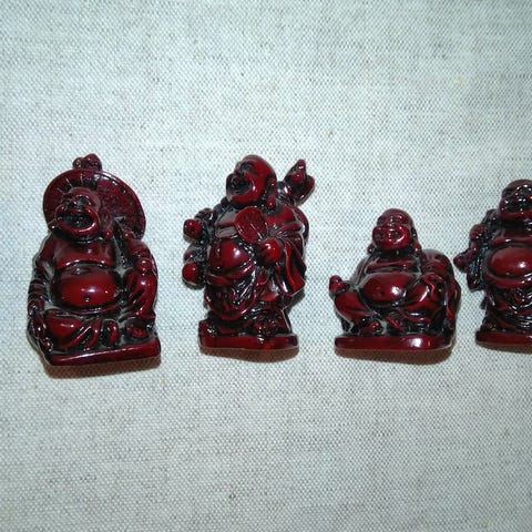 Statuerne forestiller to glade buddhastatuer. De er lavet af rød resin, et glinsende materiale.
