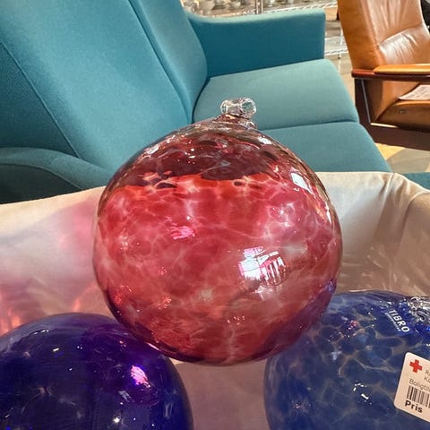 Produktet er glaskugler i forskellige størrelser. Det har en smuk, gennemsigtig overflade med en farvetone.,Afhentes i:,Røde Kors Kolding (621),Bemærk at mail, chat og beskeder ikke besvares, og varen skal købes på knappen "Gå til varen"