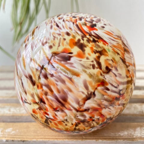 Produktet er en glasbold med en glat overflade og en gennemsigtig rød farve, der er dekoreret med et bølget mønster. Den er lavet af håndblæst glas, som giver den et unikt udseende. Størrelsen er passende til dekoration, og bolden har en lille lukning i toppen.,Afhentes i:,Røde Kors Kolding (621),Bemærk at mail, chat og beskeder ikke besvares, og varen skal købes på knappen "Gå til varen"