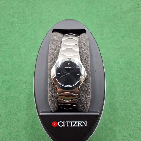 Uret har en firkantet sort urskive og en metalrem med glat, skinnende finish.