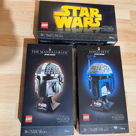 Jeg sælger en samling LEGO-hjelme. De blev udstillet på en hylde på kontoret og er i fremragende stand. Jeg har ikke den originale emballage og samlevejledningerne, men vejledningerne kan findes på internettet.