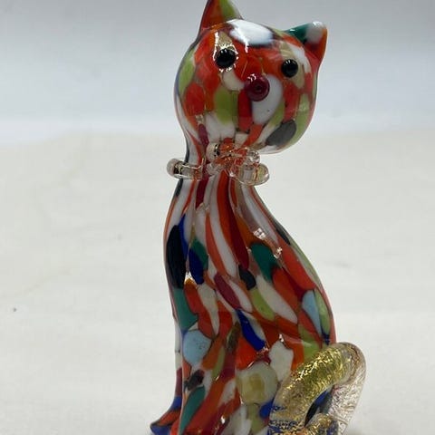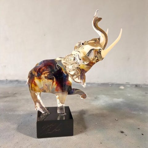 Et par dekorative skulpturer i ægte Murano-kunstglas, håndlavet i Murano. Figurerne, der forestiller en kat og en stiliseret elefant, er skabt gennem en raffineret bearbejdning af multicolour glas med dekorative indslag og detaljer i bladguld, der fremhæver hver skulpturs lysstyrke og unikke karakter og tilfører glød og håndværksmæssig værdi til hvert stykke.