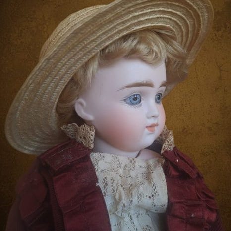 Simons Halbig porcelæns hovede dukke, tysk oprindelse, støbe 1039, periode 1850–1900, i meget god stand, ledigt sammensat krop, kysse-fremfører mekanisme virker ikke længere, iført original ivory silke kjole med matchende hat, bomuld undertøj, lædersko og strømper, naturligt hår paryk; emballage uden originalboks. Klik på den blå "gå til varen" knap, for at købe eller byde på denne vare. Den samlede pris vil blive vist inden du afgiver dit bud.