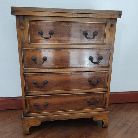 Skrivebord/kommode i eg af britisk oprindelse, ca. 1960–1970, med fem skuffer og kobberspænder, stil Georgisk/Klassisk engelsk, mål 100 × 58 × 80 cm, vægt 20 kg, i god vintage stand. Klik på den blå "gå til varen" knap, for at købe eller byde på denne vare. Den samlede pris vil blive vist inden du afgiver dit bud.