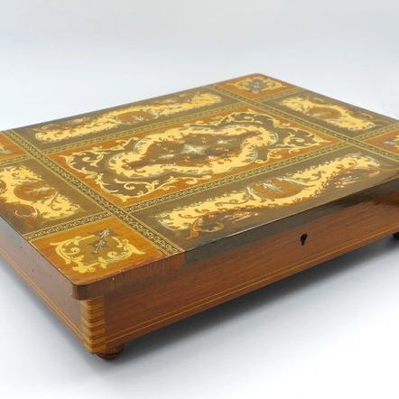 Det lille bord er udstyret med en unik indretning med fem skuffer, ideelt til opbevaring af skrivegrej, dokumenter eller personlige accessories. Skufferne er afsluttet med klassiske, ægte kobberhåndtag, der understreger det antikke karakter.