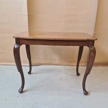 Antik salongebord i valnøtttræ med fineret overflade, UK oprindelse, dateret 1950–1960, udtrækkeligt sideblad op til 101 cm, højde 51 cm, to skuffer med messinghåndtag; god brugt stand med let alders- og plettede tegn. Klik på den blå "gå til varen" knap, for at købe eller byde på denne vare. Den samlede pris vil blive vist inden du afgiver dit bud.