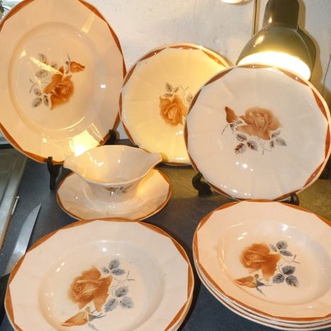 Stor Limoges porcelænsfad signeret C. Durand, dateret 1930–1940, Frankrig; diameter 34 cm, højde 4,9 cm, vægt ca. 13,7 g, i temmelig dårlig stand med synlige brugsspor, store revner, skader og mangler. Klik på den blå "gå til varen" knap, for at købe eller byde på denne vare. Den samlede pris vil blive vist inden du afgiver dit bud.