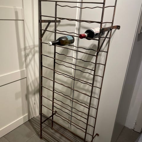 Vinskov i vertikal struktur udført i massivt træ med farvet finish i en mellemvalnød tone og satin lak. Sammenbygget konstruktion med frontpanel perforeret gennem præcise cirkulære snit til individuel opbevaring af flasker.