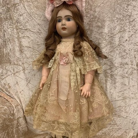 Hun har sin søde oprindelige blonde kjole i blonde (et lille hul bagpå, se billeder) chemisette i bomuld, og en anden kjole i rosa satin, paryk i naturligt hår tilført, men den følger med sin originale paryk, som har været igennem hænderne på en mor, lærlinge-frisør, sko af læder tilført, monteret på en Jumeau-krop mærket.