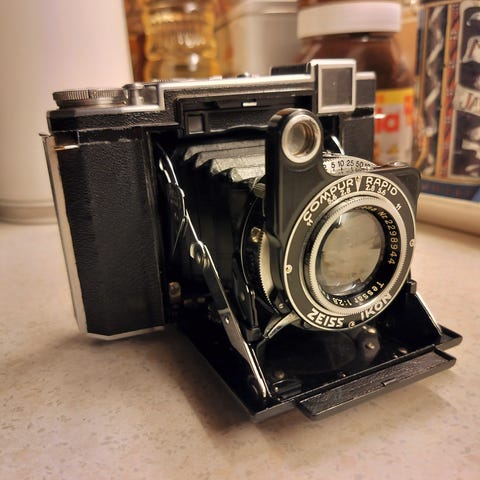 Fotokamera Exakta Varex, fotografisk objektiv Travegon 1:3,5/35 fra A. Schacht Ulm.