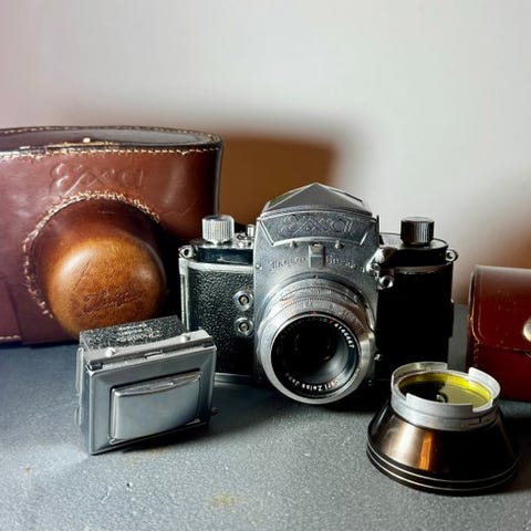 Exakta Varex IIa med Schacht Travegon 2,8/35mm objektiv på Exakta bajonetsfutter, ca. 1950–1960; fysisk tilstand god og testet og i funktion. Klik på den blå "gå til varen" knap, for at købe eller byde på denne vare. Den samlede pris vil blive vist inden du afgiver dit bud.