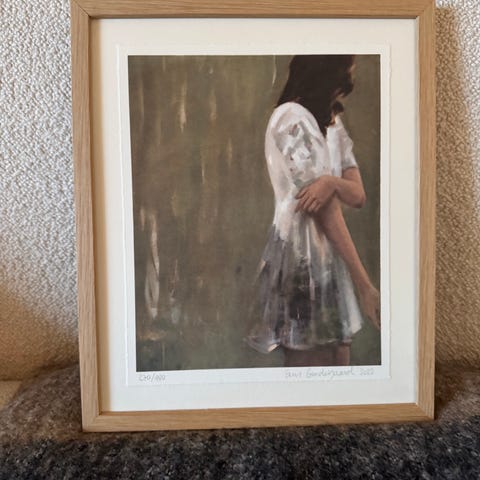 Maleri på lærred med portræt af kvinde i mønstret rød kjole. Motivet viser en afslappet siddende kvinde mod en baggrund i varme farver som orange, gul og grøn. Maleriet er udført i en ekspressiv, farverig stil med tydelige penselstrøg. Egnet til ophængning i stue, entré eller andre opholdsrum.