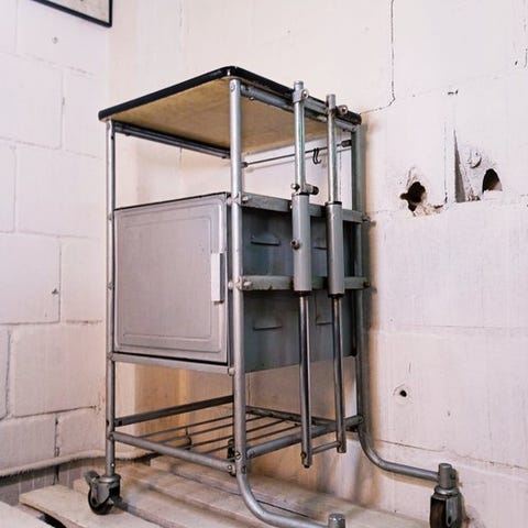 Fremstillet af pulverlakeret jern, har skabet elegante, afrundede, rektangulære glastyper på fronten og siderne. Glasset er sikkert klemmet fast i stålrammen med de originale sorte gummiliste, en detalje typisk for medicinsk møbler fra den æra, designet til holdbarhed, hygiejne og nem