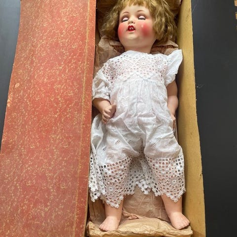 Antik belgisk papir-mache-dukment i god stand, bevægeligt legeme, blå glas soveye med vipper, paryk med ægte blondt hår, åben mund med to tænder, samlet længde 76 cm (hoved 19 cm), iført rosa organdiklæde, beige underkjole, hvide bukser og beige strømper, i erstatningsemballage. Klik på den blå "gå til varen" knap, for at købe eller byde på denne vare. Den samlede pris vil blive vist inden du afgiver dit bud.