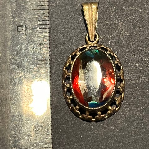 halvædelsten og macrame. Håndlavet i Mexico stor grøn sten i midten og en mindre ametyst ved siden. 6x9cm.