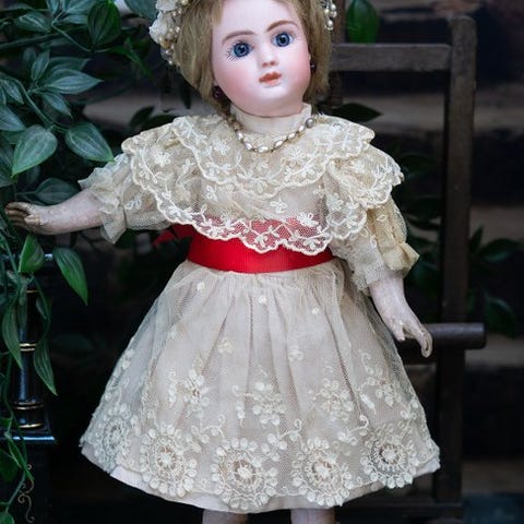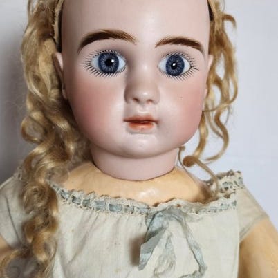 Hendes paryk er lavet af mohair, og hendes calotte er af pap, alt er originalt.