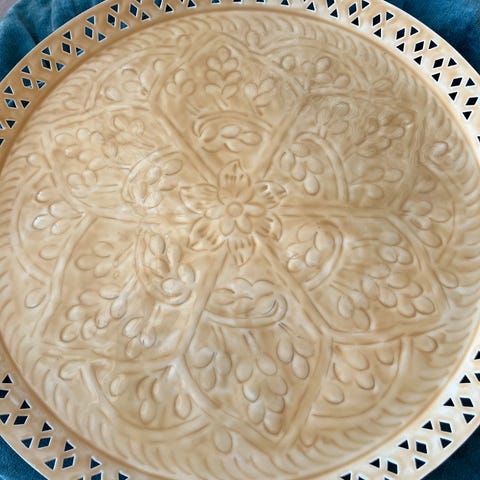 gyldent blomsterdekoration på céladongrøn baggrund og hvid og guld kant