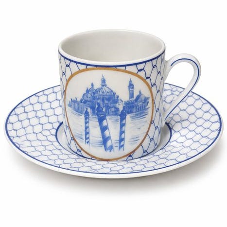 Dette bordservice dedikeret til den storslåede by udstilt i Limoges-porcelæne af Atmospheria efter designet af duoen Memory-Roubinet.