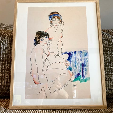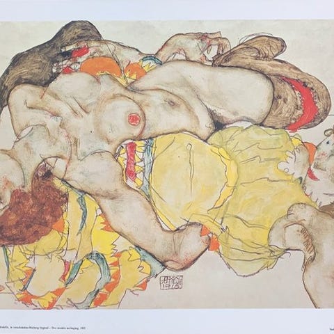 Denne litografi er baseret på en originaltegning af Egon Schiele fra 1913. Schiele var en østrigsk ekspressionistisk kunstner, kendt for sine dristige figurative værker og sine plagede selvportrætter, kendetegnet ved kantede linjer og forvredne positurer.