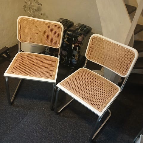 Sæt karakter på dit hjem med dette smukke sæt af to vintage frisvingerstole i klassisk stil. Stolene kombinerer lette, krombelagte stålrør med varme hvide trærammer og håndflettet sæde og ryg i naturmateriale – en harmonisk blanding af industrielt design og organisk æstetik.