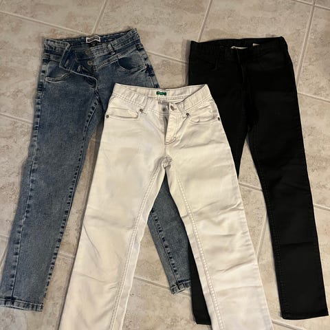 Sorte, blå og beige lange bukser til piger i str. 32, 34 og 36. Der er alle jeans. De er alle i fin stand og kommer fra røgfrit hjem. Prisen er pr. stk.