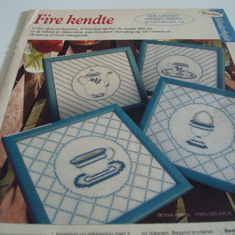 Nogle sider fra et gammelt nummer af månedsbladet Alt om Håndarbejde med broderimønster / tællediagram samt arbejdsgang til til nogle fine små motiver af kokke i køkkenet broderet i korssting.
