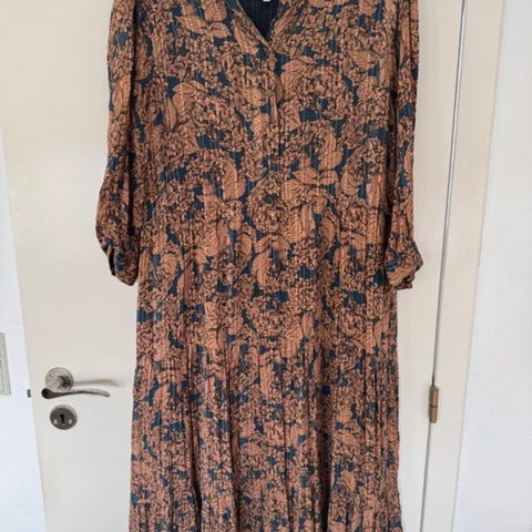 Lollys laundry hverdagskjole i grå bomuld i størrelse S. Kjolen har lange ærmer og V-udskæring med læg foran.