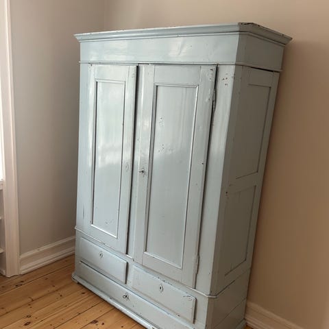 Meget stort og flot franskt osteskab, brugt til opbevaring af alt fra rulleskøjter, gummistøvler, bøger, støvsuger, overskydende tøj (der er en bøjlestang øverst), huer, vanter, kasketter, playstation, legetøj osv osv.