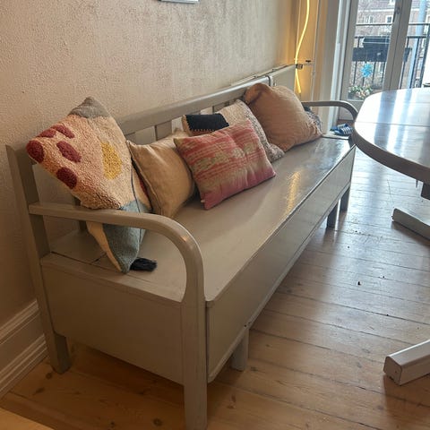 Gammel svensk slagbænk med stort opbevaringsrum. Mål: 187 l 55 d 45 sh 1400kr...Kan levere til kantsten mod betaling. Nye grønne pudder 175kr stk. Gammel oldemor pude 300kr.